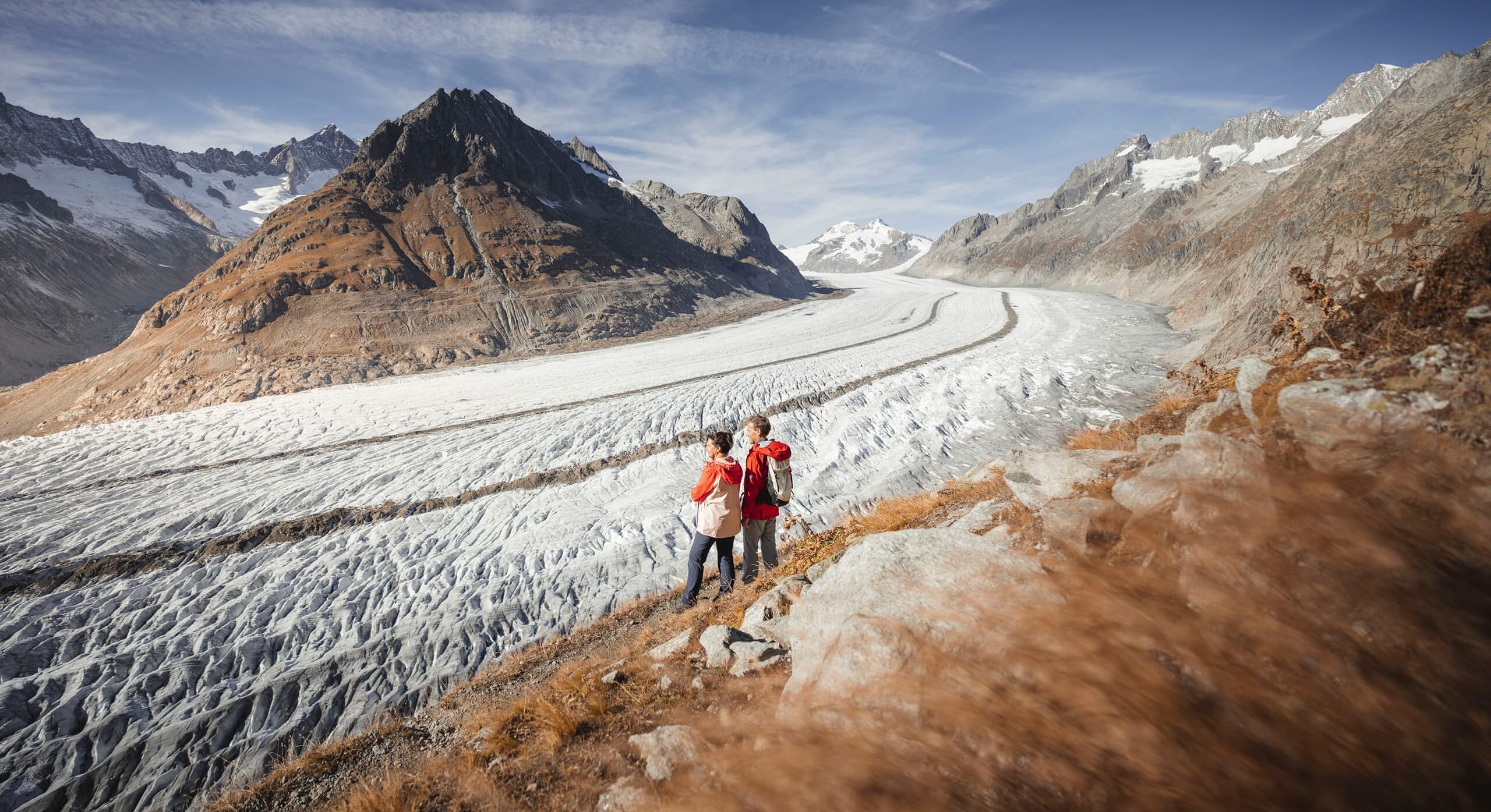 Discover the Aletsch Arena at its best and day-hike the Aletsch Glacier Trail. This trail, beginning at the Moosfluh upper cable station, starts above Riederalp and ends after 12 kilometers at the Fiescheralp upper cable station. It is a perfect day hike for all hikers who want to see the Aletsch Glacier in full glory. The panoramic views of the largest glaciers in the Alps never get boring on this trail while you hike in the UNESCO World Heritage site. Please note that you’re not hiking on the Aletsch Glacier on this trail.