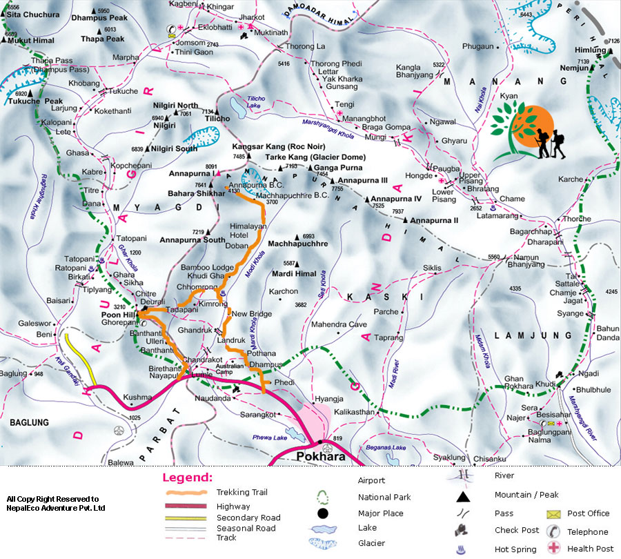 All of the gear listed here can be found in all knock-off markets of Kathmandu or Pokhara. Some small gear can be replaced in some shops during the trail, but choice can be limited with higher prices. Not that they are necessary, but you can find most bookshops in Kathmandu have cheap paper maps of the region. You can pack some snacks from Kathmandu and Pokhara that will be cheaper, like nuts, snickers, biscuits, tea bags, coffee bags, honey, peanut butter, etc but the Annapurna has a nice supply chain and often you can find most of the snacks and drinks you can imagine in all the tea houses there.