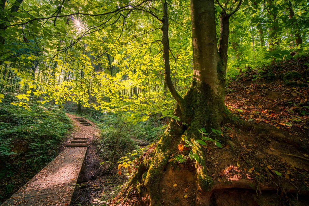 However, as well as numerous rock and cave formations, there are many other highlights on the Mamerleeën Guttland.Trail which will tempt you to relax and stop for a break. For example, the large picnic table near the “Huellee” has a lovely view of Schoenfels Castle and is perfect for a mid-hike break. Walk just a little further and you’ll come to the “Hunnebuer” local recreation area, a place associated with many sagas and legends.