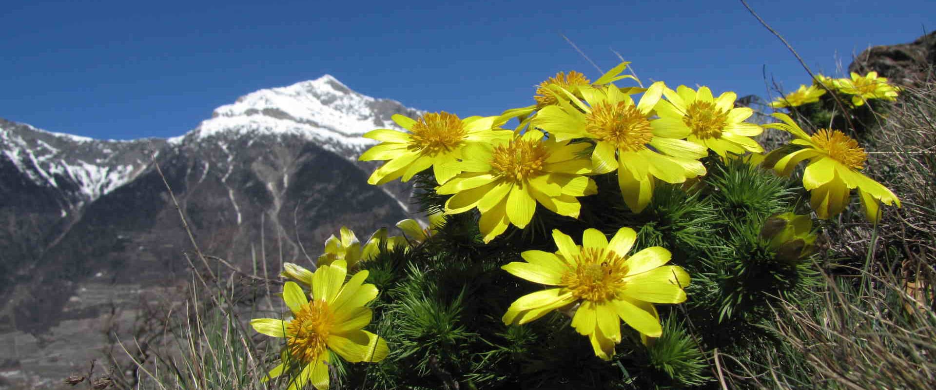 The adonis is native to Eurasia. It is present in Valais: at the Follatères in Martigny, in Charrat, Saxon, Riddes, Coor/Nendaz, Bramois, Nax, Agarn, and Tourtemagne. Adonis is protected in Valais. Let us not give in to the temptation of picking. But adonis is not the only interest of this region. Oak, Scots pine, field maple, and cherry occupy the northern side of the hill. In the groves, you may also recognize the barberry, the black elderberry, the common juniper, and the rosehip.
